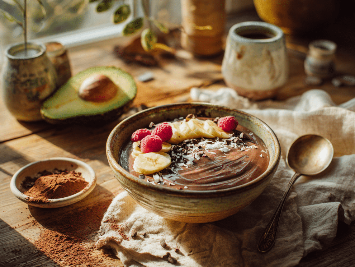 Most smoothie bowls rely on frozen banana as their base, which means they all end up tasting like banana no matter what else you add. This recipe takes a different approach by using ripe avocado as the primary thickener instead. The result is a genuinely chocolatey bowl where the cacao flavour comes through clean and rich without competing with banana sweetness.