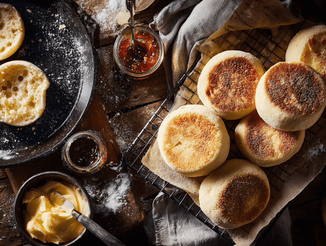 Cornmeal dusting on the muffins’ bottoms is not just for aesthetic or traditional reasons. It serves a practical purpose, preventing the muffins from sticking to the surface during cooking, while adding a slight crunch that plays perfectly against the pillowy interior. And that coveted nooks-and-crannies structure? It’s the result of a well-hydrated dough, careful handling, and proper cooking technique: slow griddling on a dry cast-iron skillet allows for even browning and finishing without drying out the inside.