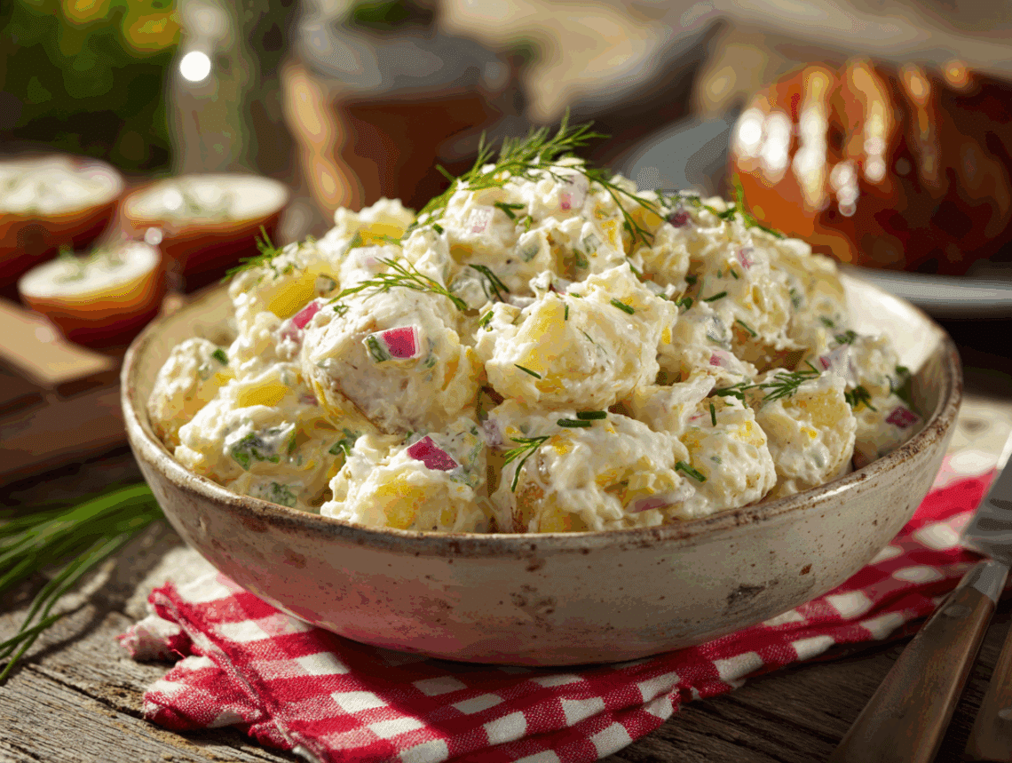 Whether served alongside grilled burgers at a summer barbecue, paired with roasted chicken during a Sunday supper, or enjoyed as a satisfying leftover from a family gathering, this potato salad celebrates wholesome ingredients, humble origins, and the joy of sharing good food with people you love.