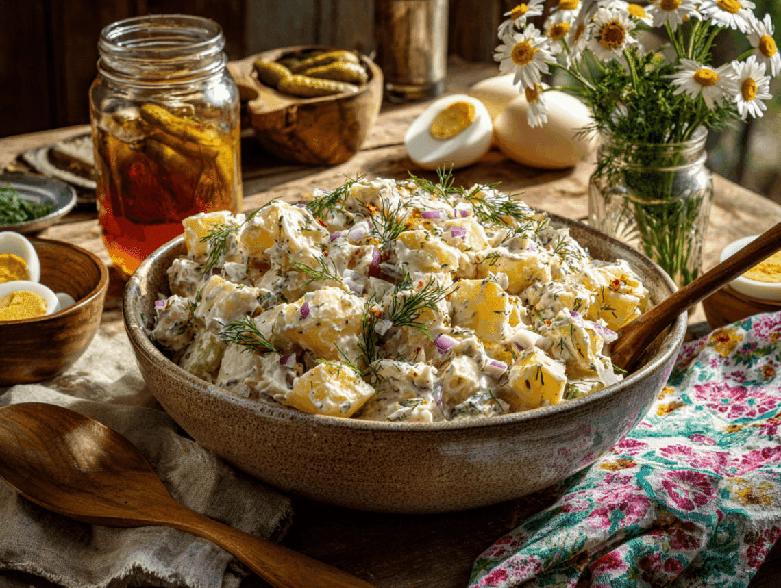 The dressing itself is where the magic truly happens. A blend of full-fat mayonnaise, tangy Dijon mustard, and apple cider vinegar creates a silky, bright base that clings to each warm potato chunk. A touch of kosher salt and freshly ground black pepper brings harmony, while chopped sweet pickles and fresh dill add character and unexpected bursts of flavor that elevate every bite. The key here is balance—between creamy and crunchy, savory and sweet, fresh and familiar.