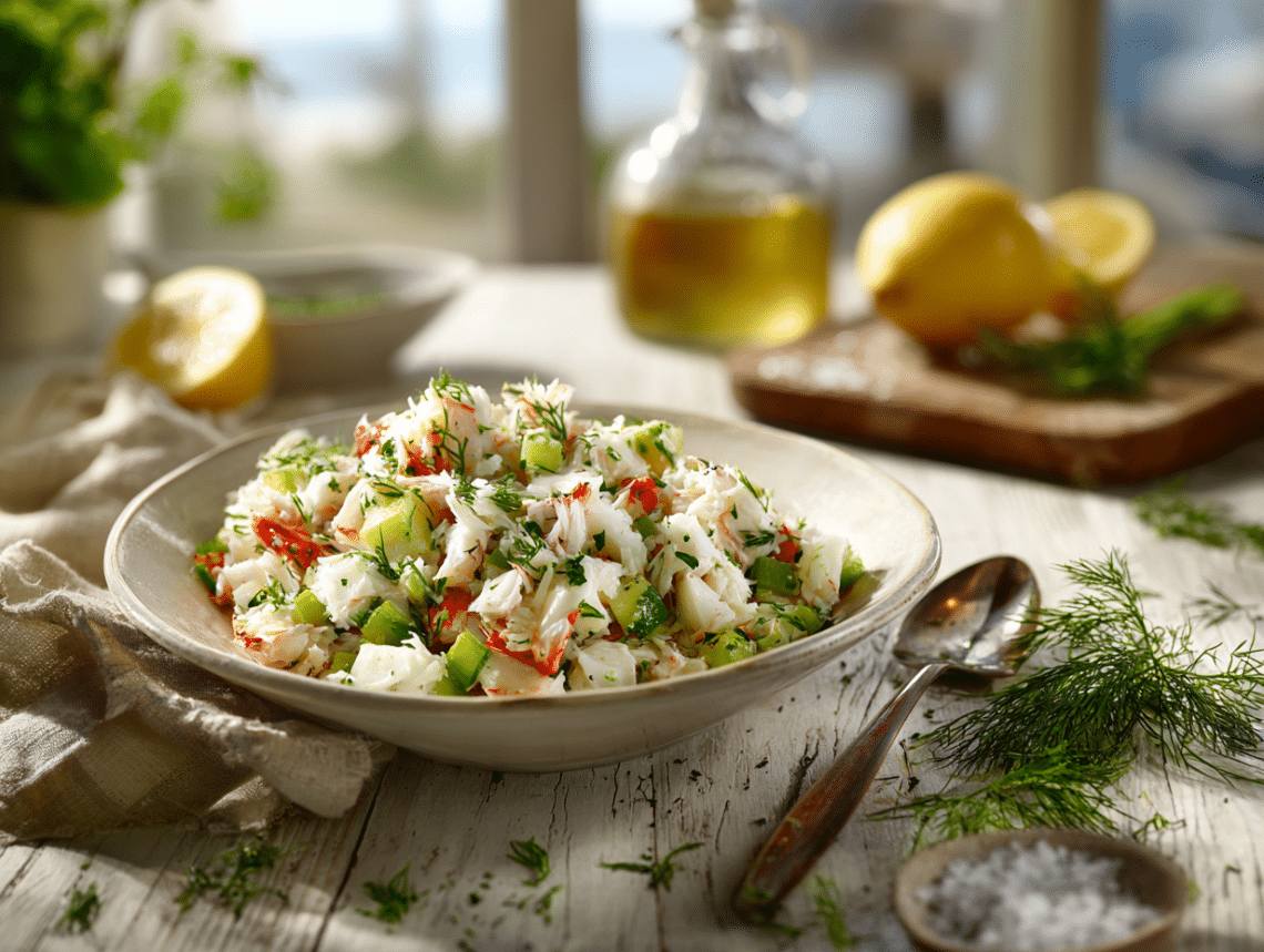 The lemon-herb vinaigrette is equally thoughtful. It’s a bright, emulsified dressing made with fruity extra virgin olive oil, zesty lemon juice and zest, a touch of Dijon mustard for silkiness and tang, and a sprinkle of sea salt and black pepper for balance. This dressing isn’t meant to saturate the crab — just to gently lift it, wrapping each bite in a citrusy glow that echoes those Mediterranean days.