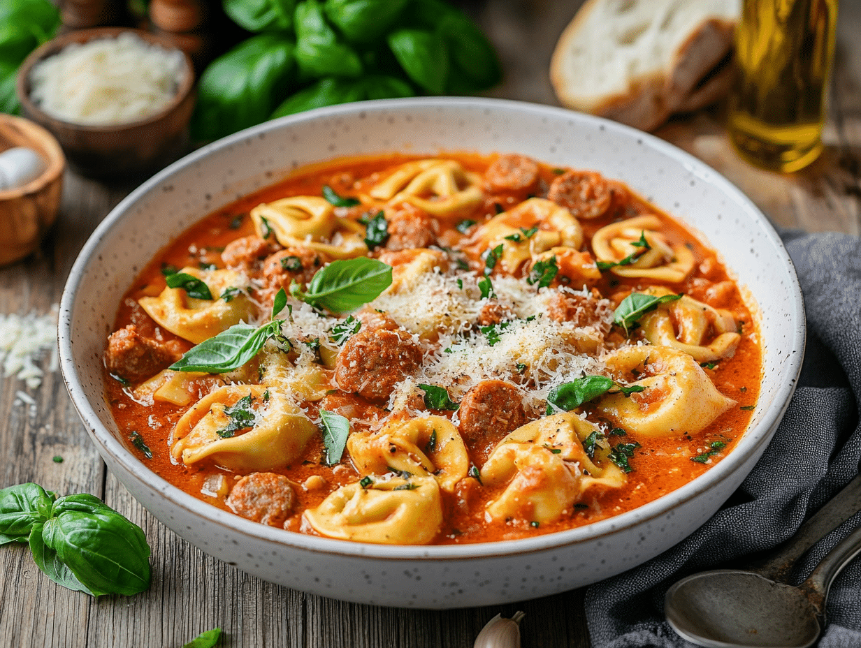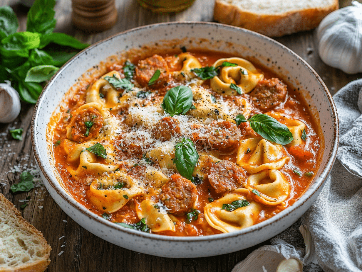 Cheese-filled tortellini, the soul of this dish, adds a soft, luxurious bite—combining beautifully with the sausage to create a robust canvas of flavors. Traditional tortellini has its roots in Northern Italy and is known for its pillow-like texture and rich fillings. Using fresh or store-bought tortellini allows for versatility in preparation, accommodating both those seeking a speedy weeknight dinner and those with time to create pasta from scratch.