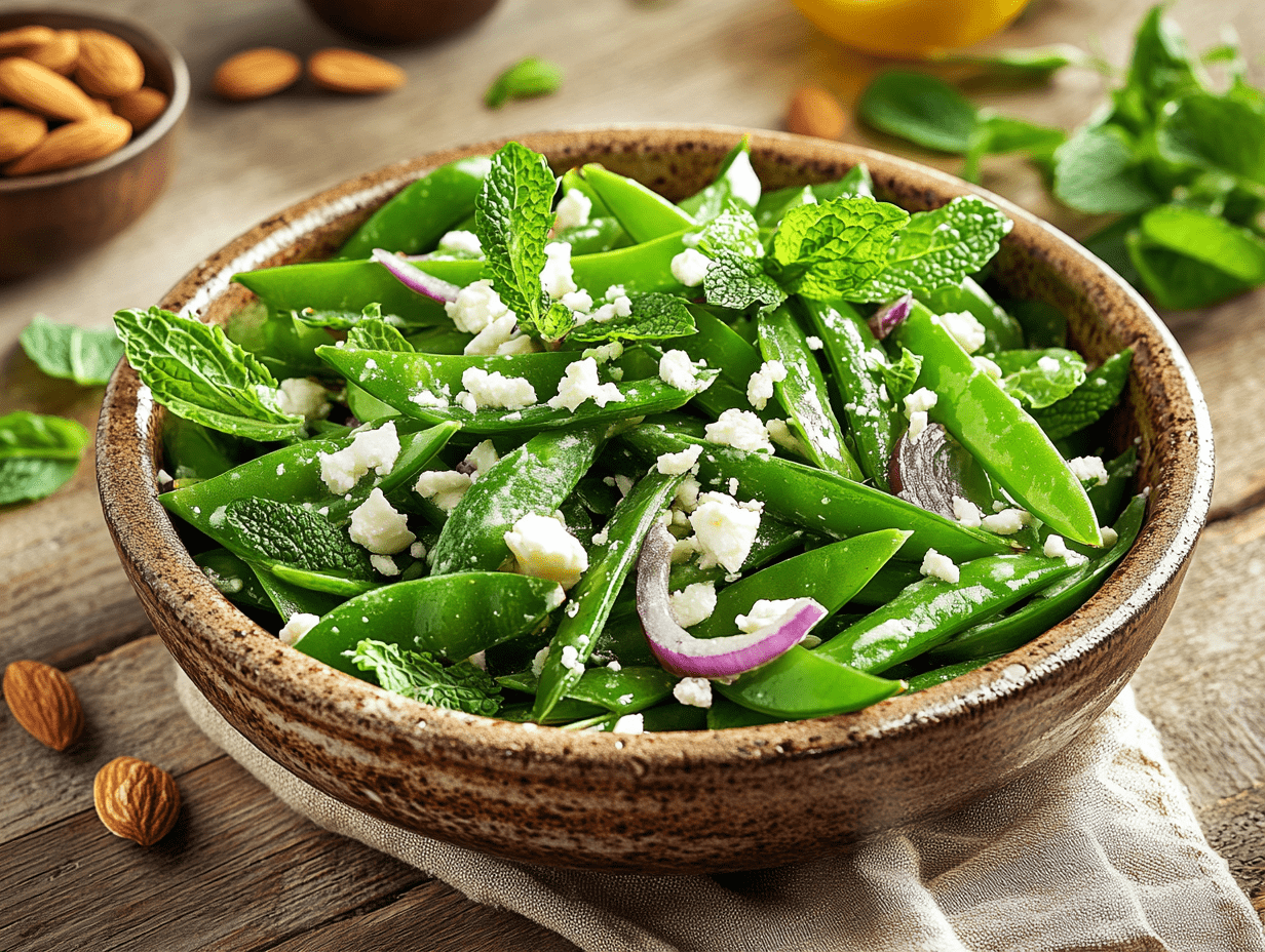 One of the best things about this salad is its ease of preparation. With just 15 minutes of prep time and no cooking required, it’s perfect for busy weeknights, potlucks, or summer gatherings. The combination of fresh, vibrant ingredients ensures that every bite is light and full of flavor, making it a nutritious and satisfying dish. Additionally, this salad celebrates the beauty of simplicity in cooking—when you have high-quality ingredients, you don’t need complex techniques to bring out their best flavors. The crunch of snow peas, the brightness of mint, the nuttiness of almonds, and the tanginess of the lemon dressing create a balance that is both refreshing and elegant.