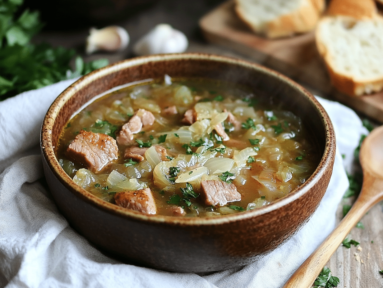 Pork Cabbage Soup is a wonderfully hearty and comforting dish with deep Eastern European roots. This nourishing, flavorful soup is not only a staple in many households but also a cherished recipe that brings a sense of warmth and tradition to the dining table. With its combination of tender pork, savory cabbage, and rich broth infused with aromatic seasonings, this soup is perfect for cold winter evenings, providing both sustenance and a sense of home-style cooking.