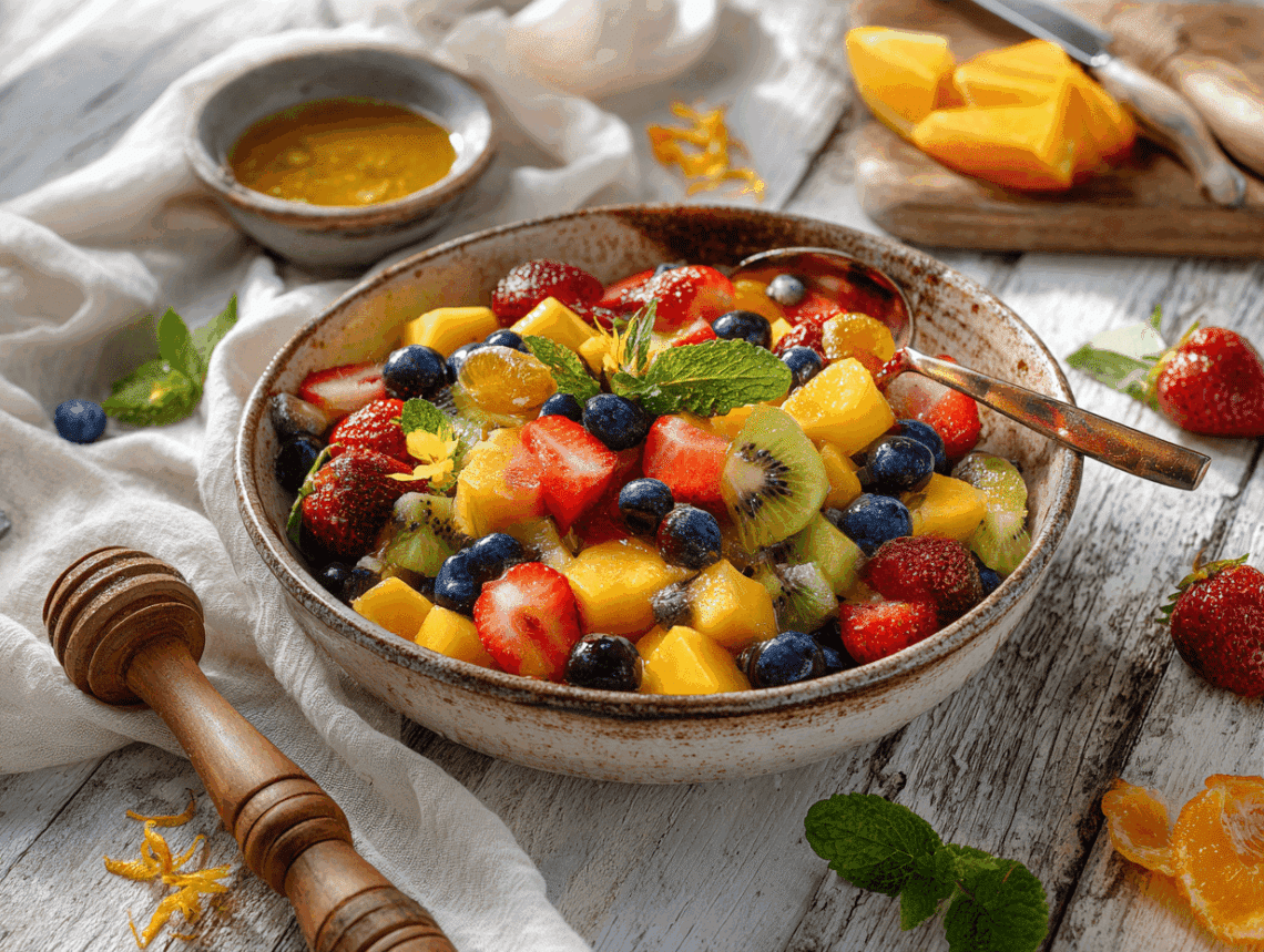 But what truly ties this mélange of fruits together is the citrus-honey dressing, a nod to the citrus groves of Sicily and the herbal tradition of mint in Mediterranean cooking. The dressing’s ingredients are minimal: fresh orange and lime juice provide a piquancy and brightness that naturally enhance the sweetness of the fruit. A touch of local honey offers a gentle floral note and luxurious texture. Orange zest adds depth, and finely chopped mint finishes it all with an aromatic flourish.