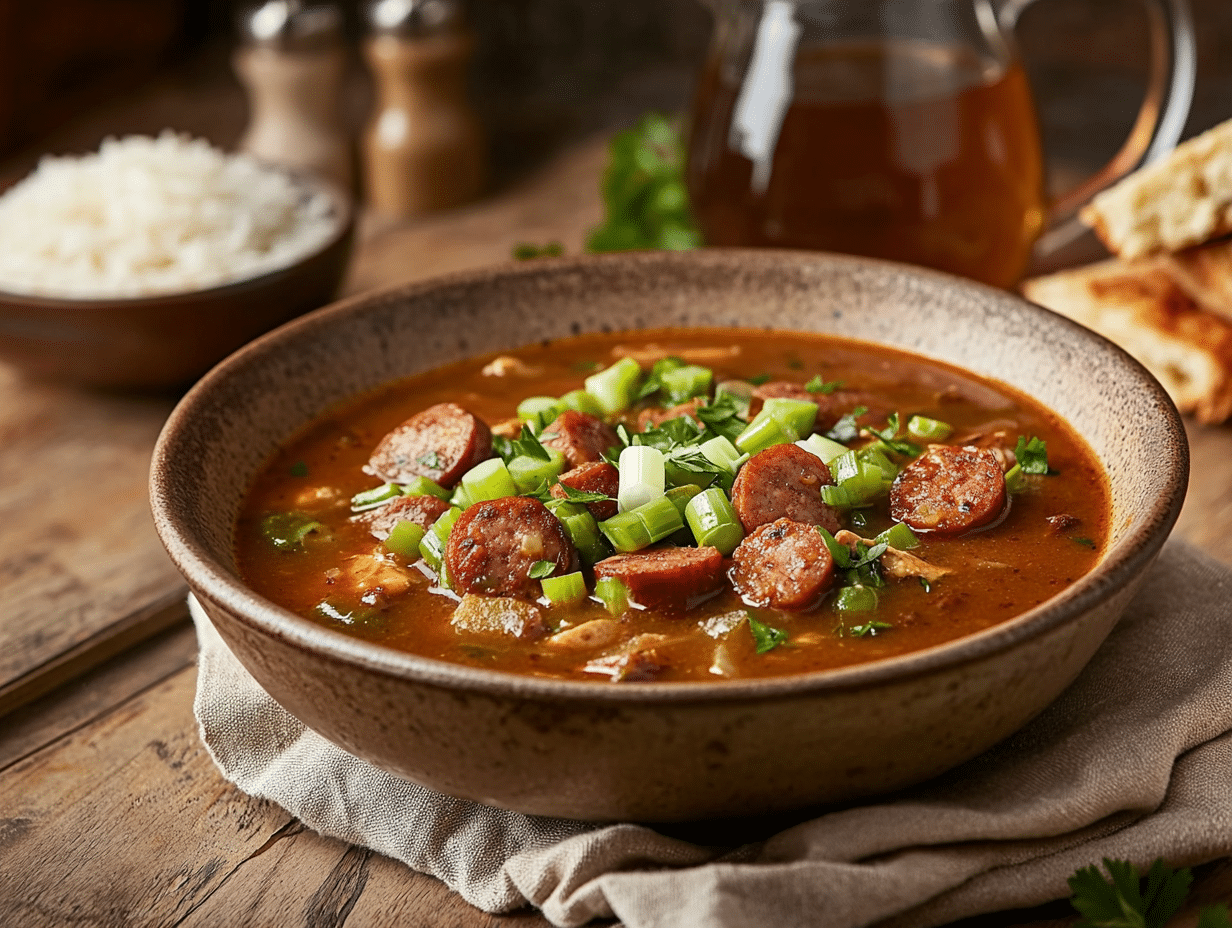What sets gumbo apart is its versatility. While this recipe is anchored by andouille sausage and chicken, other variations might take on a seafood twist with shrimp, crabmeat, or even crawfish—a nod to Louisiana’s bountiful Gulf Coast. Served hot over a bed of perfectly cooked rice, gumbo becomes even more special when garnished with freshly chopped scallions and parsley for brightness.