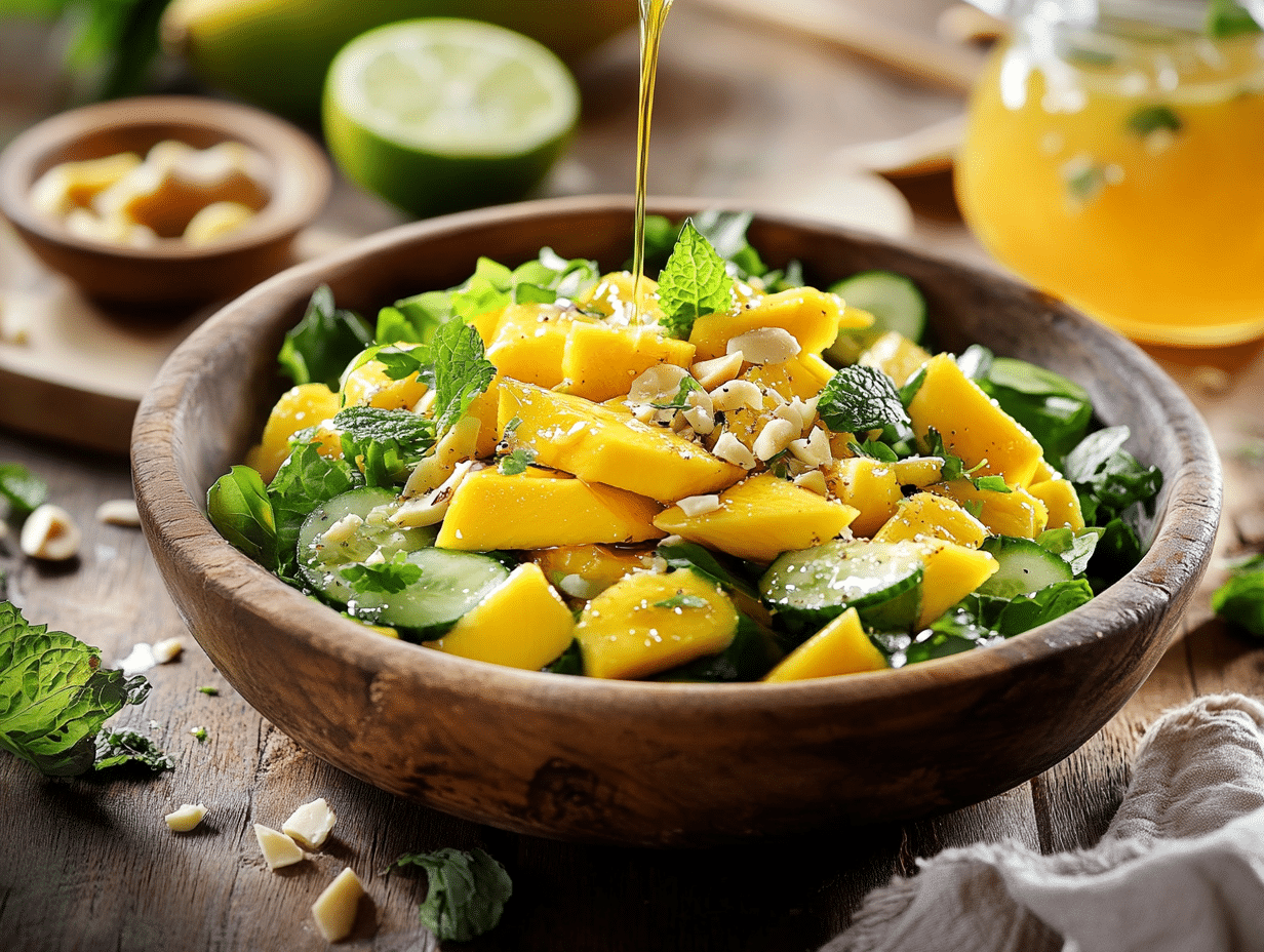 The dressing, made with extra virgin olive oil, fresh lime juice, and honey, adds a balance of tangy and sweet flavors, highlighting the freshness of the mango. The addition of red onions provides a slight sharpness that contrasts beautifully with the fruit’s sweetness.
