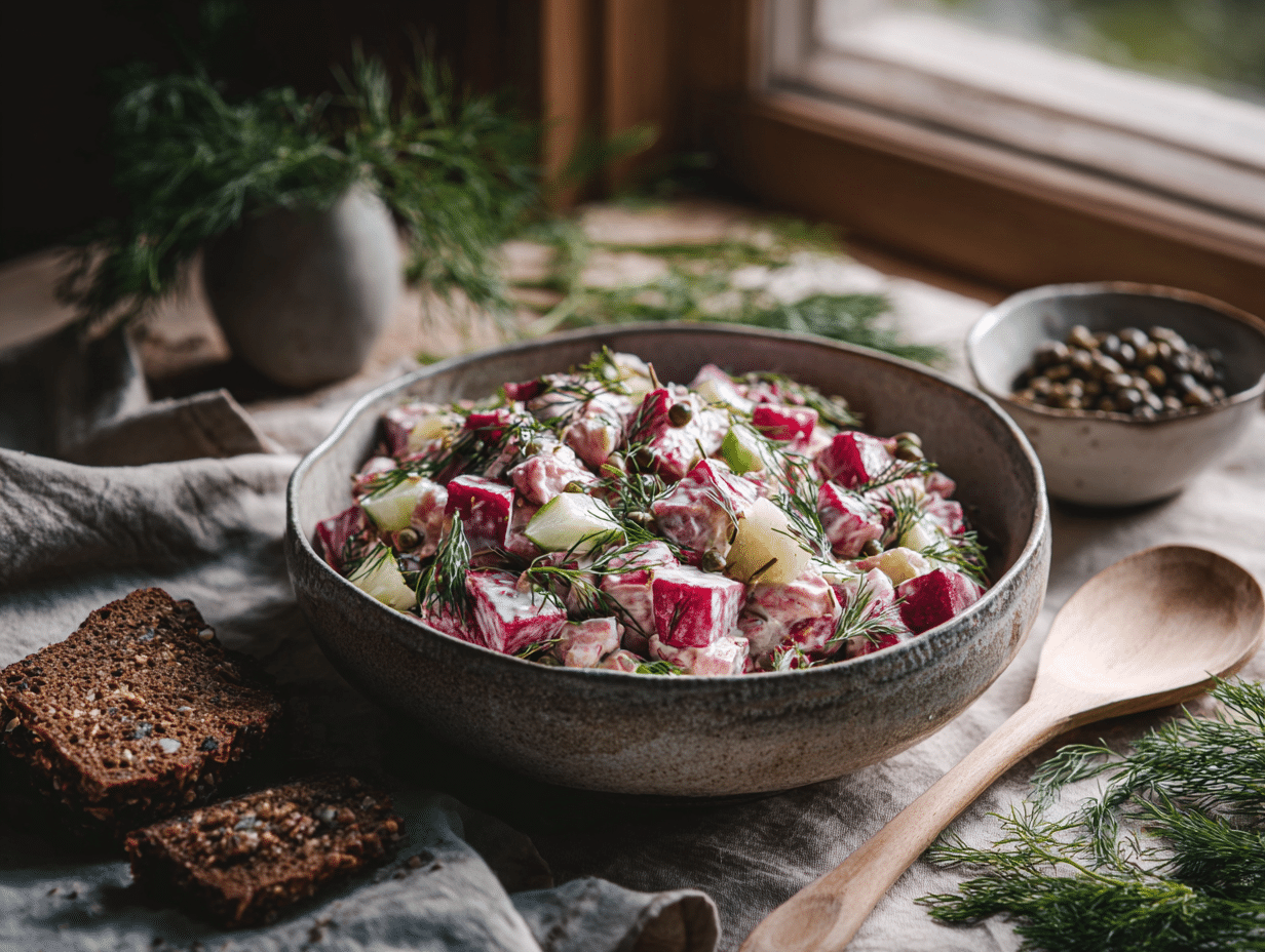 The use of pickled herring in Danish cooking goes back centuries. Before refrigeration, salting and pickling were essential methods of preserving fish. As a result, herring became an accessible, nutritious source of protein for many coastal communities. Over time, herring also became associated with festive occasions—especially during Christmas, Easter, and midsummer feasts—transforming from a utilitarian necessity to a cherished delicacy. This salad, which pairs the complex, briny herring with earthy beets, tart apples, and creamy potatoes, is a delicious evolution of that tradition.