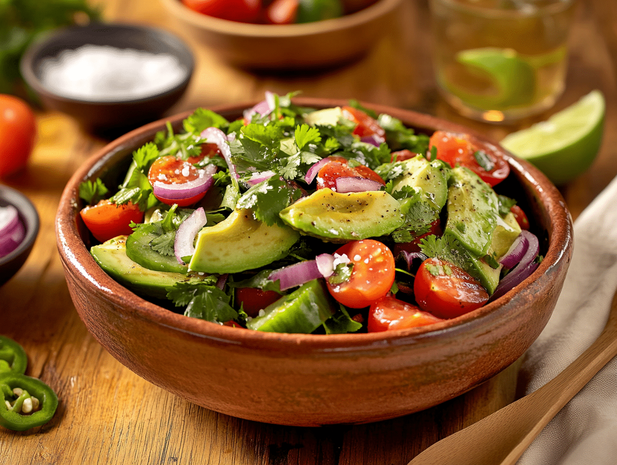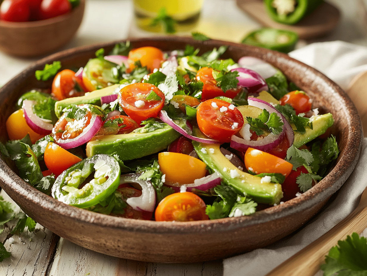 Nopalitos Salad is a refreshing dish that highlights bright, zesty flavors and vibrant colors. Alongside the cactus paddles, ingredients such as cherry tomatoes, red onions, fresh cilantro, and avocado contribute to the salad’s depth in flavor and nutrition. Lime juice and olive oil serve as the dressing, bringing acidity and smoothness to balance the dish. The inclusion of black pepper and sea salt enhances the natural flavors of the ingredients, while optional jalapeños or chili powder can be added for a kick of heat.