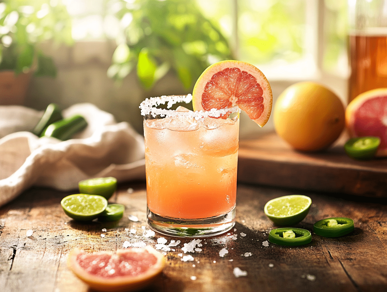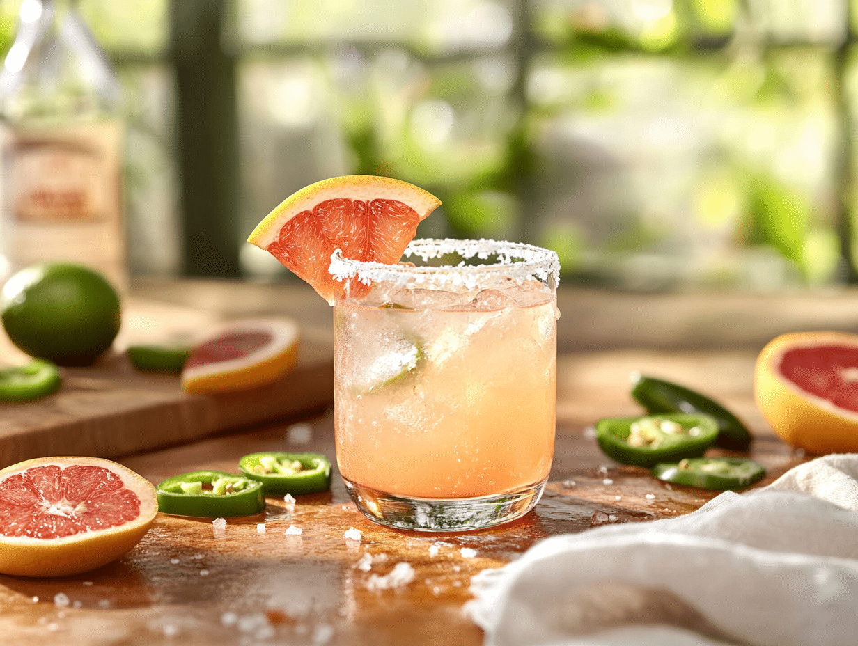 - Garnish with a slice of grapefruit and a jalapeño slice for a vibrant presentation.
