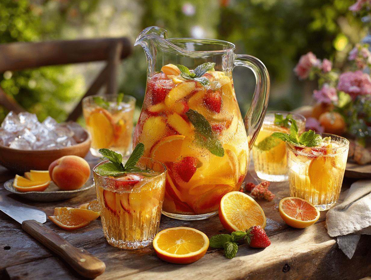 But what really sets this sangria apart is its embrace of peak seasonal fruit. Ripe, juicy peaches—synonymous with summer—add fleshiness and fragrance, while strawberries introduce vibrant color and a subtle tartness. Citrus slices give the drink its signature brightness, both visually and in flavor. A few sprigs of mint wake up the palate with refreshing herbal notes, enhancing the sangria’s cooling effect on a hot day.