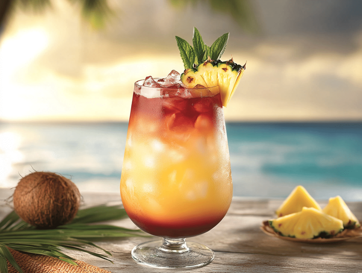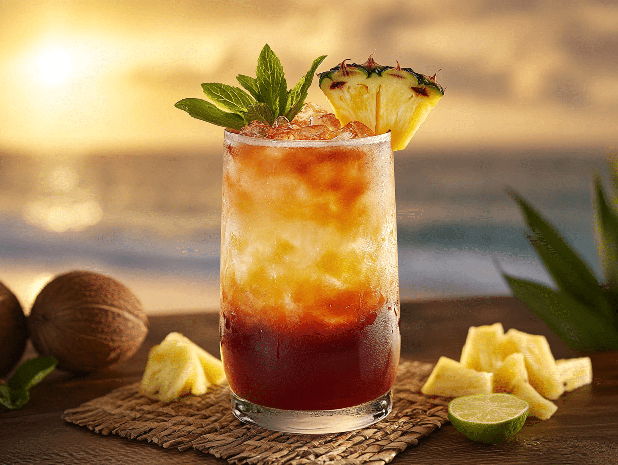 Every sip of this cocktail is an invitation to pause, relax, and imagine yourself gazing at the horizon to the sound of crashing waves. The garnishes—a slice of fresh pineapple, a sprig of mint, and a lime wedge—are more than mere decorations; they’re an embodiment of the lushness and vibrancy of Hawaii itself. Together, they make the drink as much a feast for the eyes as for the palate.