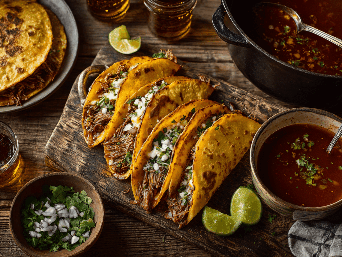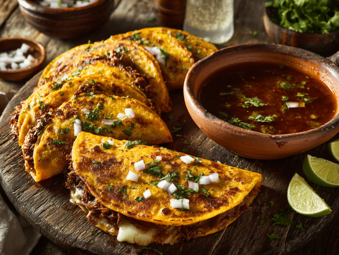 Los toques de cebolla blanca picada, cilantro fresco y lima aportan brillo para equilibrar la riqueza, mientras que un cuenco de consomé humeante a un lado añade dramatismo visual y una explosión de sabor a cada salsa. Tanto si se sirven como un capricho de comida callejera o como comida casera, estos tacos de birria hablan tanto de tradición como de innovación, donde chocan los métodos de cocina ancestrales y la creatividad culinaria contemporánea.