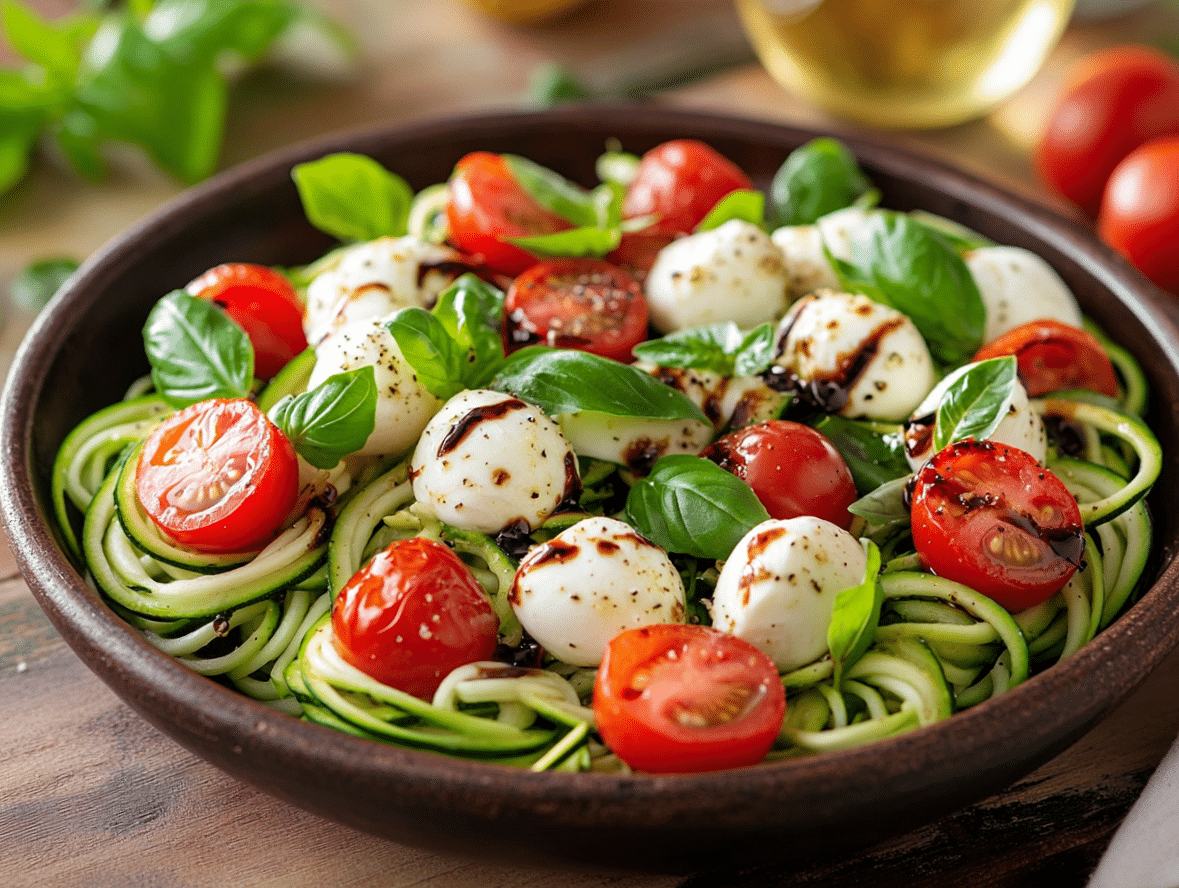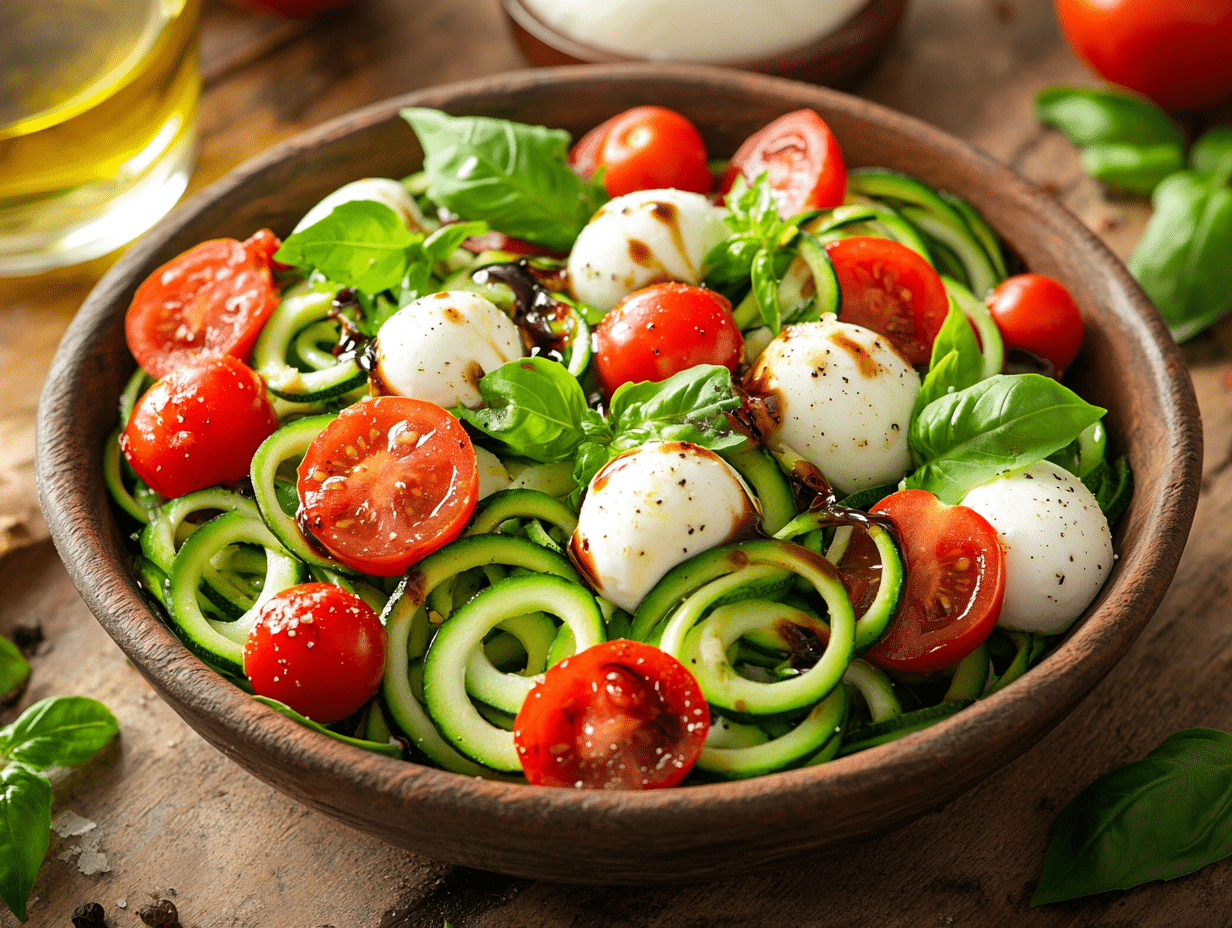The Zucchini Noodle Caprese Salad is a modern spin on the classic Italian Caprese salad, which traditionally features fresh tomatoes, mozzarella, and basil, dressed simply with olive oil and balsamic vinegar. This dish embraces the essence of Caprese flavors while adding a health-conscious twist by replacing pasta with spiralized zucchini noodles.
