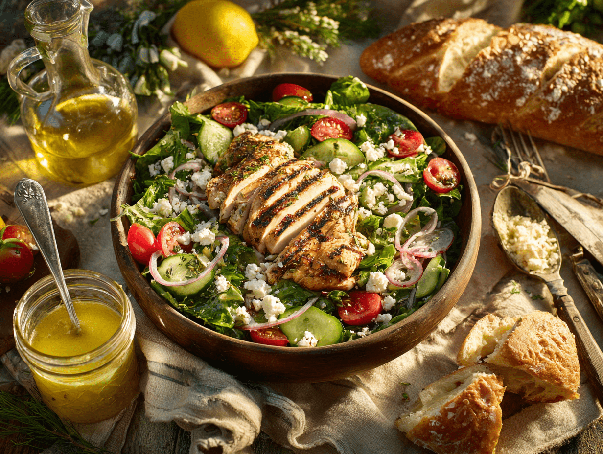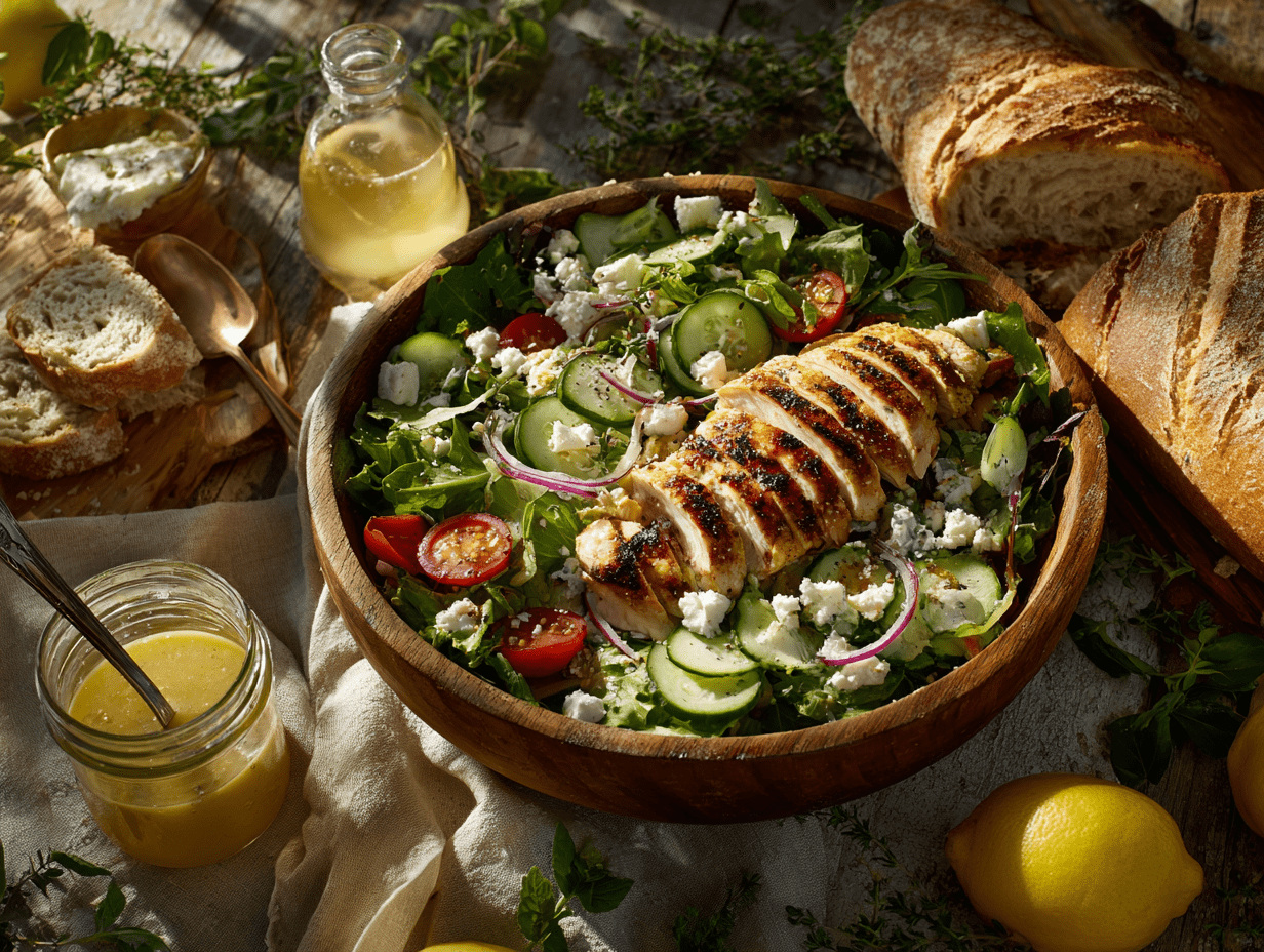 The “Herbed Grilled Chicken Salad with Lemon-Dijon Vinaigrette” is a delightful convergence of Mediterranean flavors, fresh seasonal produce, and simple culinary techniques that celebrate the beauty of balanced eating. This recipe brings together the heartiness of grilled chicken with the brightness of herbs, the crispness of garden vegetables, and the tangy elegance of a citrus-based vinaigrette. Inspired by the flavors of the Greek Isles and coastal Mediterranean regions, this dish is both rustic and refined—perfect for anyone looking to enjoy a health-conscious yet deeply satisfying meal.
