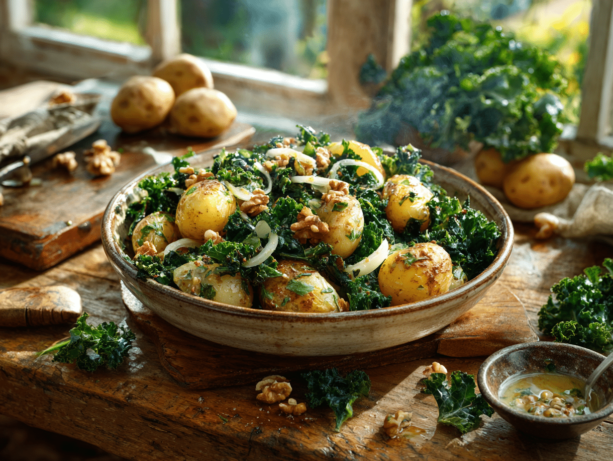 - Add cooked bacon (or walnuts), scallions, and vinaigrette to the warm potatoes and kale. Toss gently to combine, ensuring the vinaigrette coats all ingredients evenly.