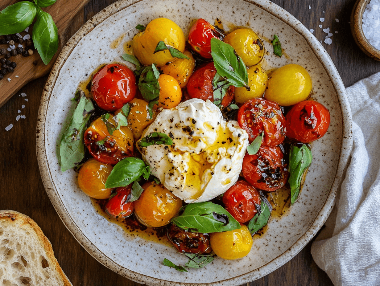 The pairing of tomatoes with fresh cheese is deeply rooted in both Italian and Mediterranean cuisines. Italy, in particular, is known for its caprese salad, which traditionally features tomatoes, mozzarella, basil, olive oil, and balsamic vinegar. This recipe takes that idea a step further by replacing the usual fresh mozzarella with burrata, a luxurious, creamy-centered cheese that originates from the Puglia region of Italy.