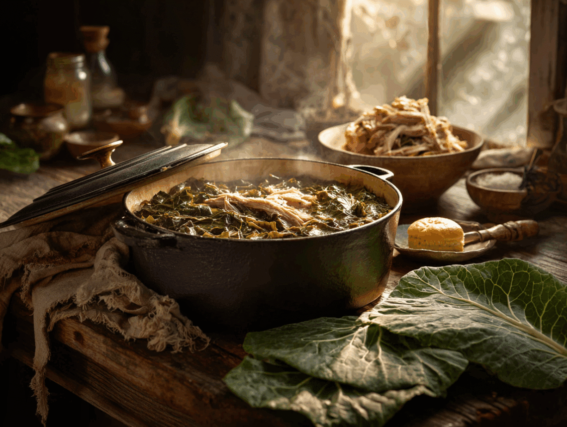 This recipe is often associated with the warmth of Sunday dinners and holiday tables, especially New Year’s Day in the South, when collard greens are traditionally served to symbolize prosperity. The green leaves represent folded money, while accompanying dishes like black-eyed peas represent coins. This symbolic meal is a beautiful ritual of hope and remembrance, bridging past and future through the shared experience of food.