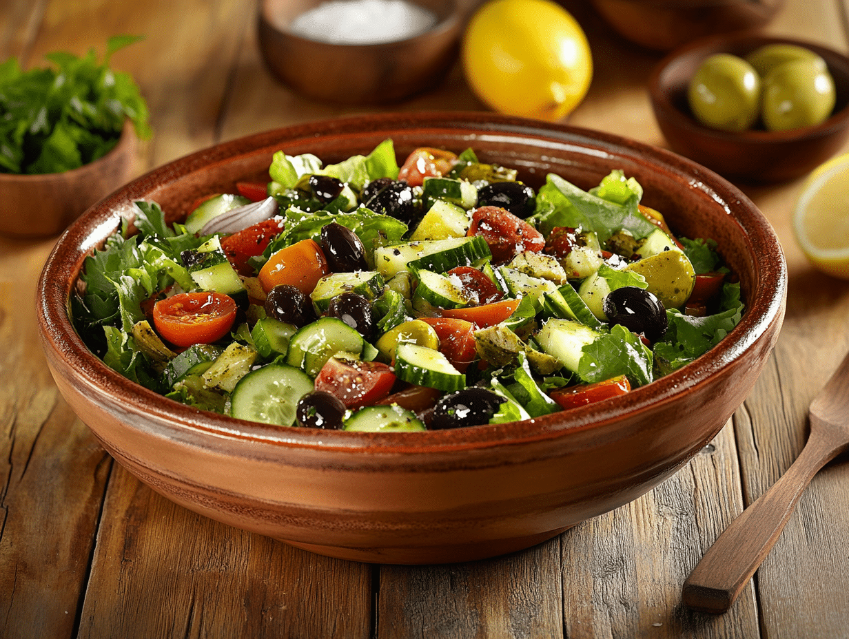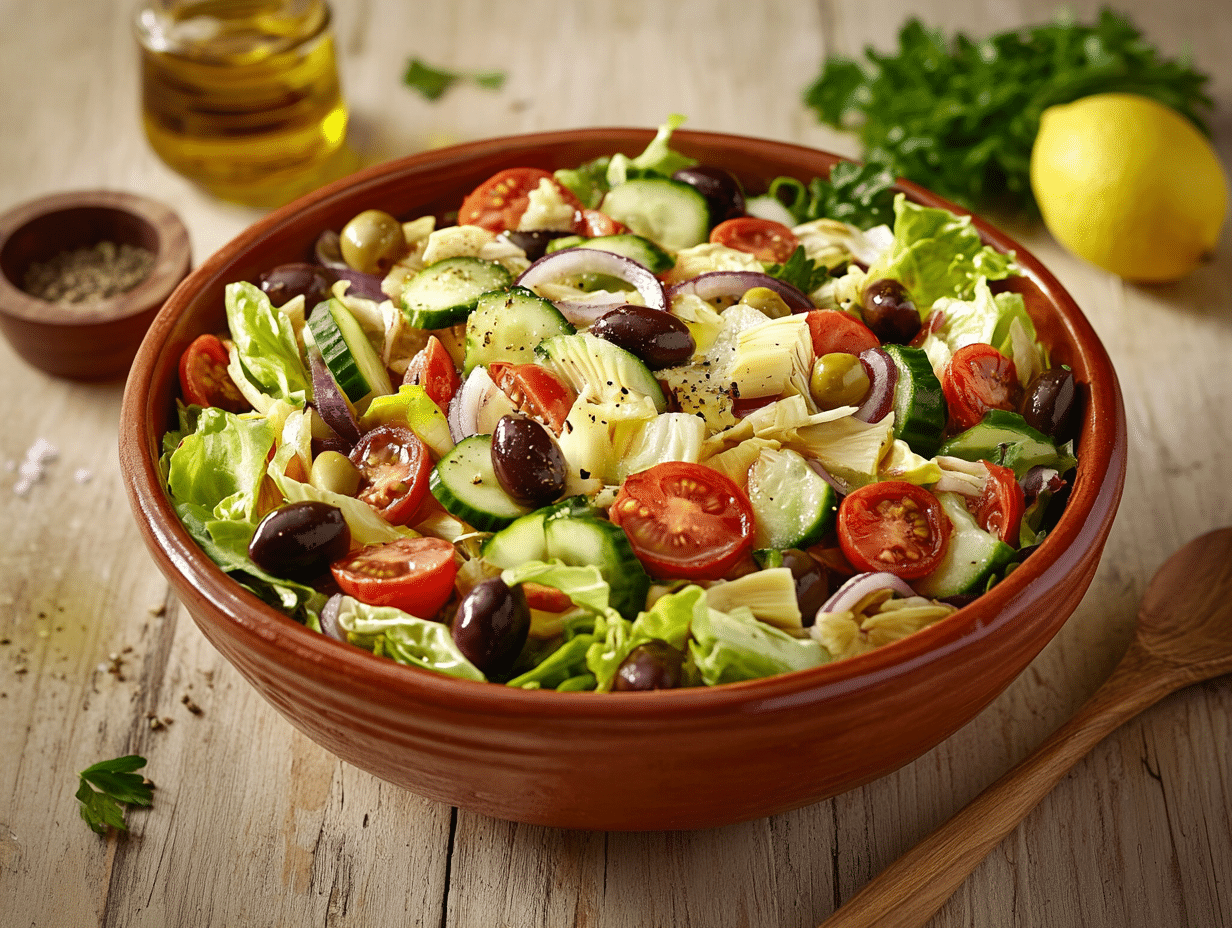The success of this salad lies in the freshness and quality of its ingredients. Romaine lettuce provides a crisp base, offering an ideal texture to contrast with the juiciness of heirloom tomatoes. Cucumbers add a cooling refreshment, while red onions bring a subtle sharpness. The inclusion of black olives and artichoke hearts introduces a briny depth, and capers enhance the salad with bursts of tangy complexity.