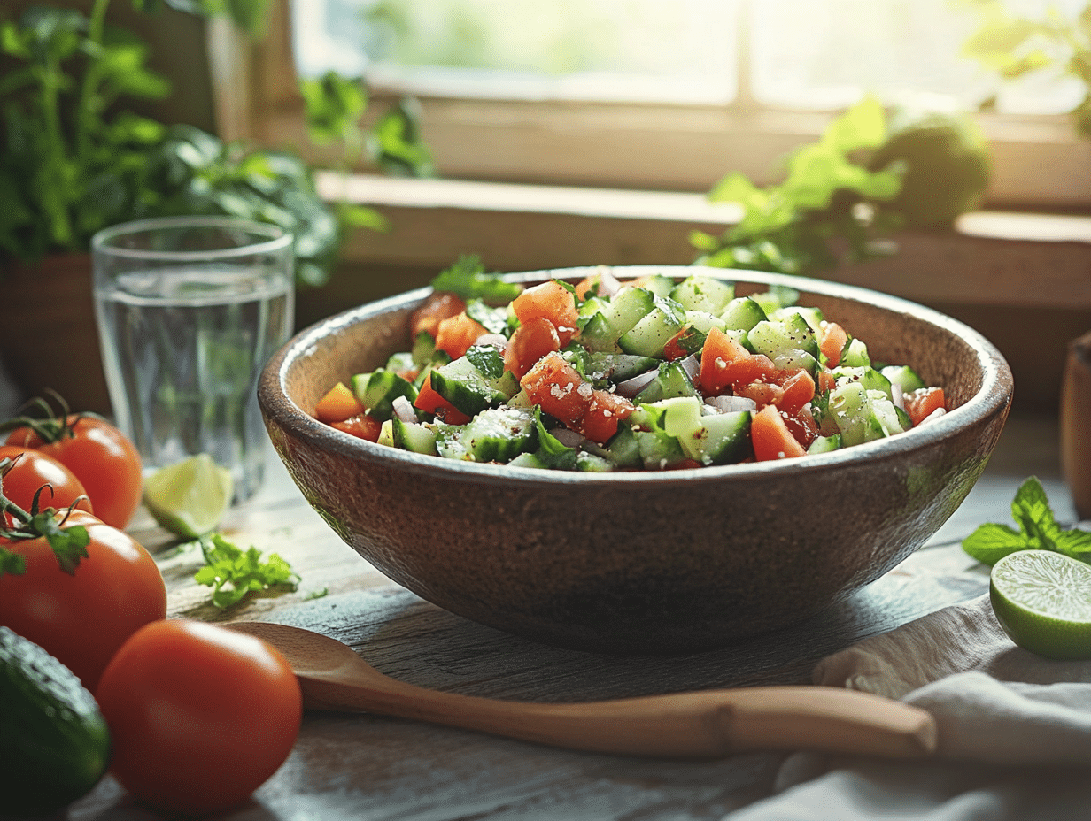 The foundation of Shirazi Salad consists of simple yet wholesome ingredients: Persian cucumbers, ripe tomatoes, and red onion, all finely chopped to create a balanced texture. The secret to its distinct taste lies in the fresh herbs—parsley and mint—which add a burst of aroma and enhance the overall freshness of the dish. The dressing, a delicate blend of extra virgin olive oil, fresh lime juice, salt, and black pepper, ties the ingredients together, allowing their natural flavors to shine. Traditionally, some variations also include dried mint, which accentuates the herbaceousness of the salad even further.
